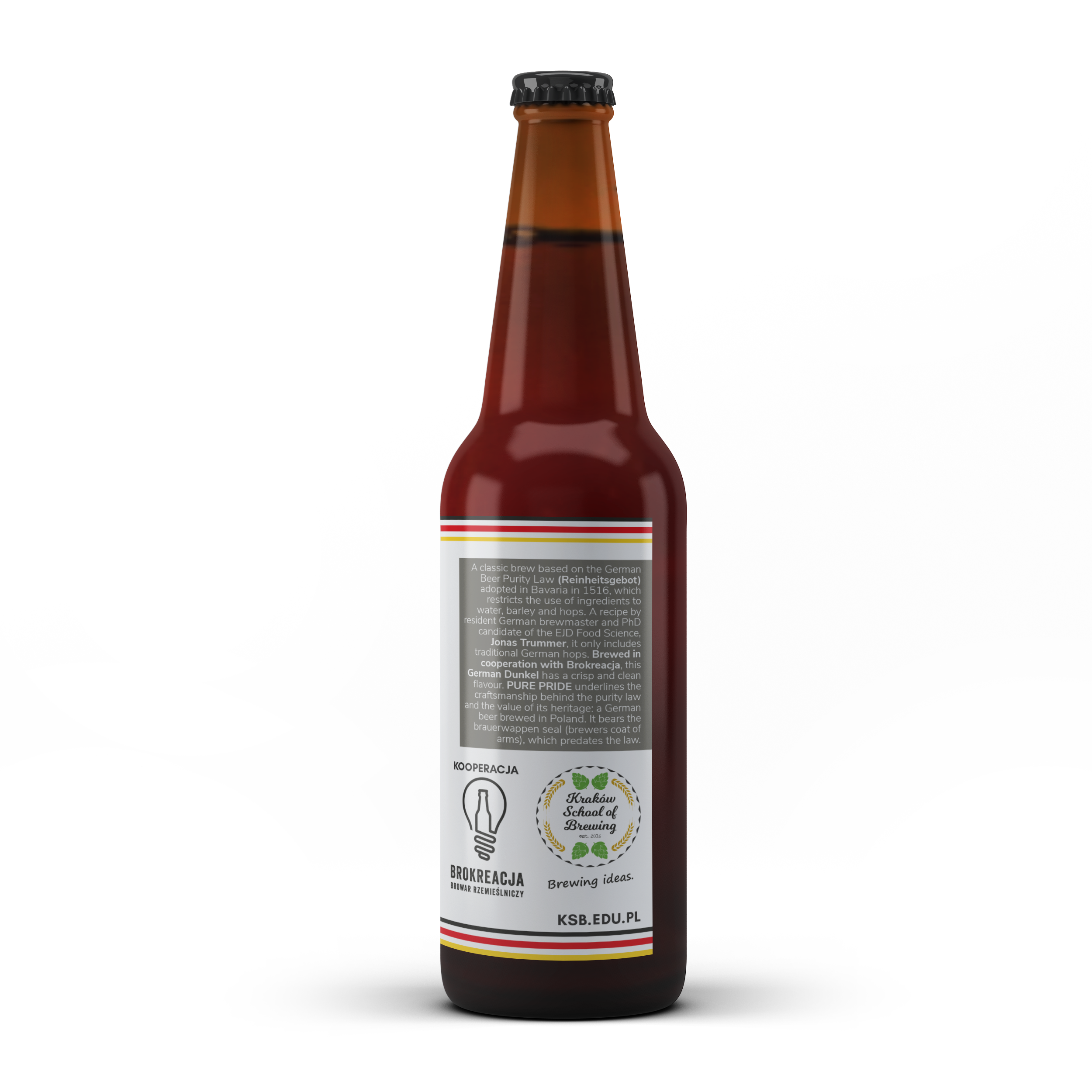 After more than 2 years of hard work and fun, the University of Agriculture in Kraków (URK) is proud to present the University Brewery and its first commercial brew, PURE PRIDE. The launch of this German Dunkel on the market is the result of a series of academic initiatives and fruitful collaborations, both at a local and international level. All of them carried out and spurred by the Kraków School of Brewing (KSB), the overarching organisation and team of all things brewing and malting at the university. The University Brewery wouldn’t have become a reality without the European Joint International PhD in Food Science (EJD), of which URK is the consortium leader. Brewmaster Jonas Trummer-EJD_ESR1, a PhD candidate of the programme, is the author of the recipe and is currently living in Kraków. The commercialisation of PURE PRIDE would not have been possible without the support of craft brewery Brokreacja and Restauracja Regionalna “Marysia” z Minibrowarem located in Szczyrzyc, one of the oldest brewing bastions in Poland. The KSB team is happy to welcome you to the launching day of PURE PRIDE, and encourages you to taste not only its pure and crisp flavour, but to savour the atmosphere that ensues from Brewing ideas.